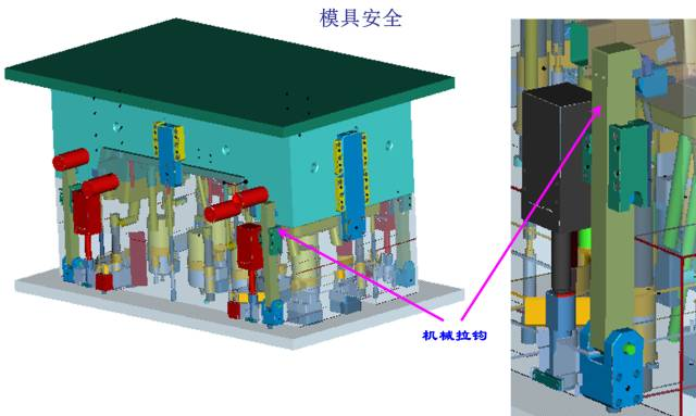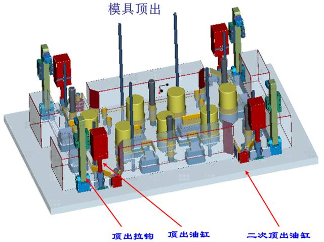 (1)第一級(jí)頂出采用4個(gè)油缸頂出同前模同步運(yùn)動(dòng)頂出60MM,4個(gè)拉鉤為輔助機(jī)構(gòu);